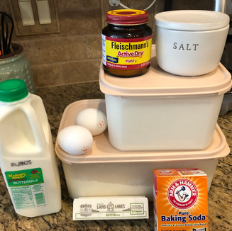 Once he remeasured those ingredients, he added the eggs and baking soda. I was impressed he remembered how to use the flap to get the right amount! He also added in the cooled buttermilk and two cups of flour. Then he added in the dissolved yeast. We mixed it up slightly and added one more cup of flour.